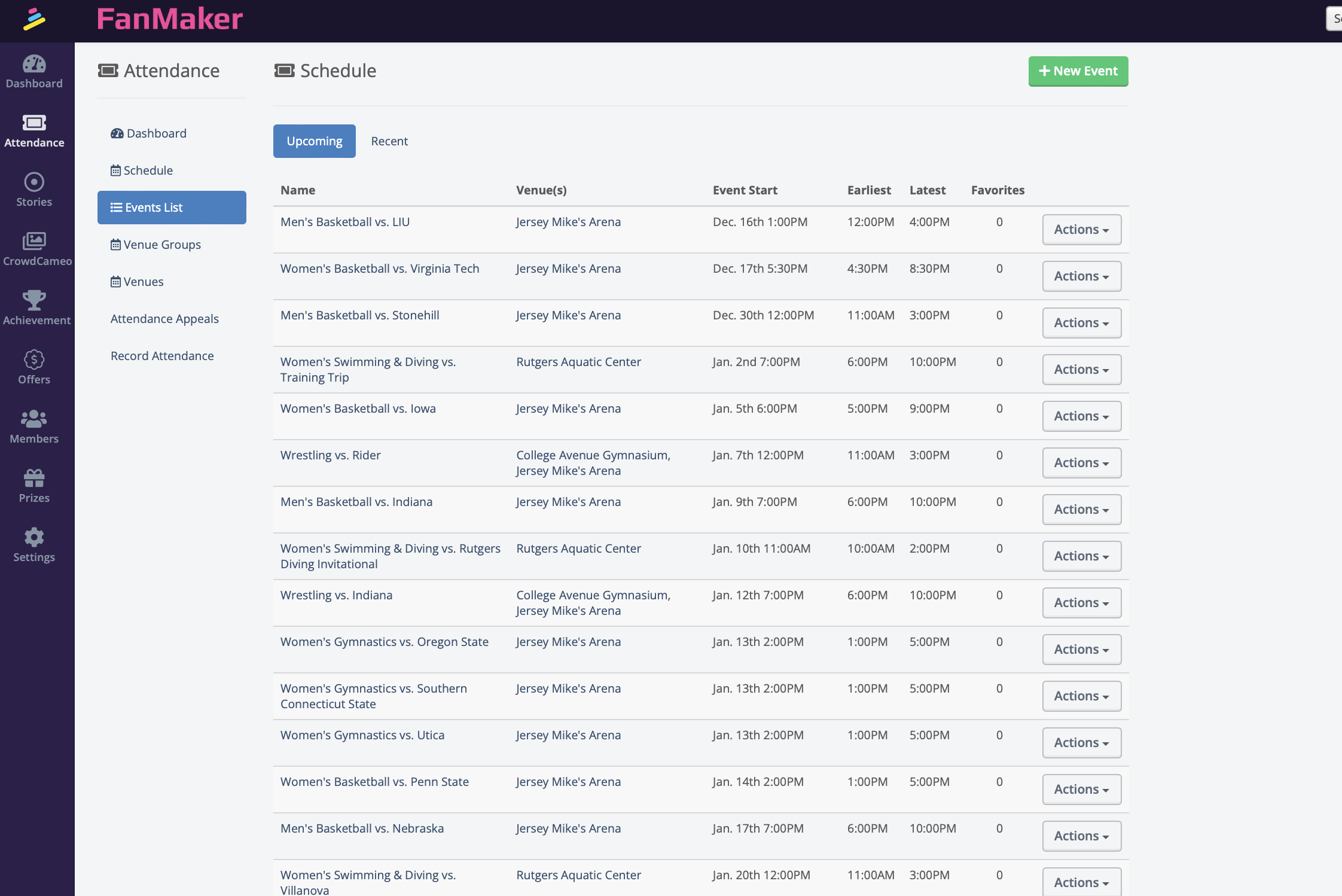 This provides all of your upcoming and recent events in a list, ordered by most recent in the “Recent” tab and by earliest date in the “Upcoming” tab. You can also create a new event here by selecting the “New Event” button.