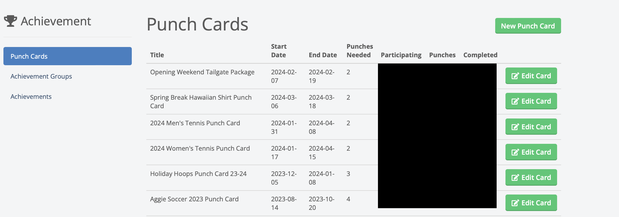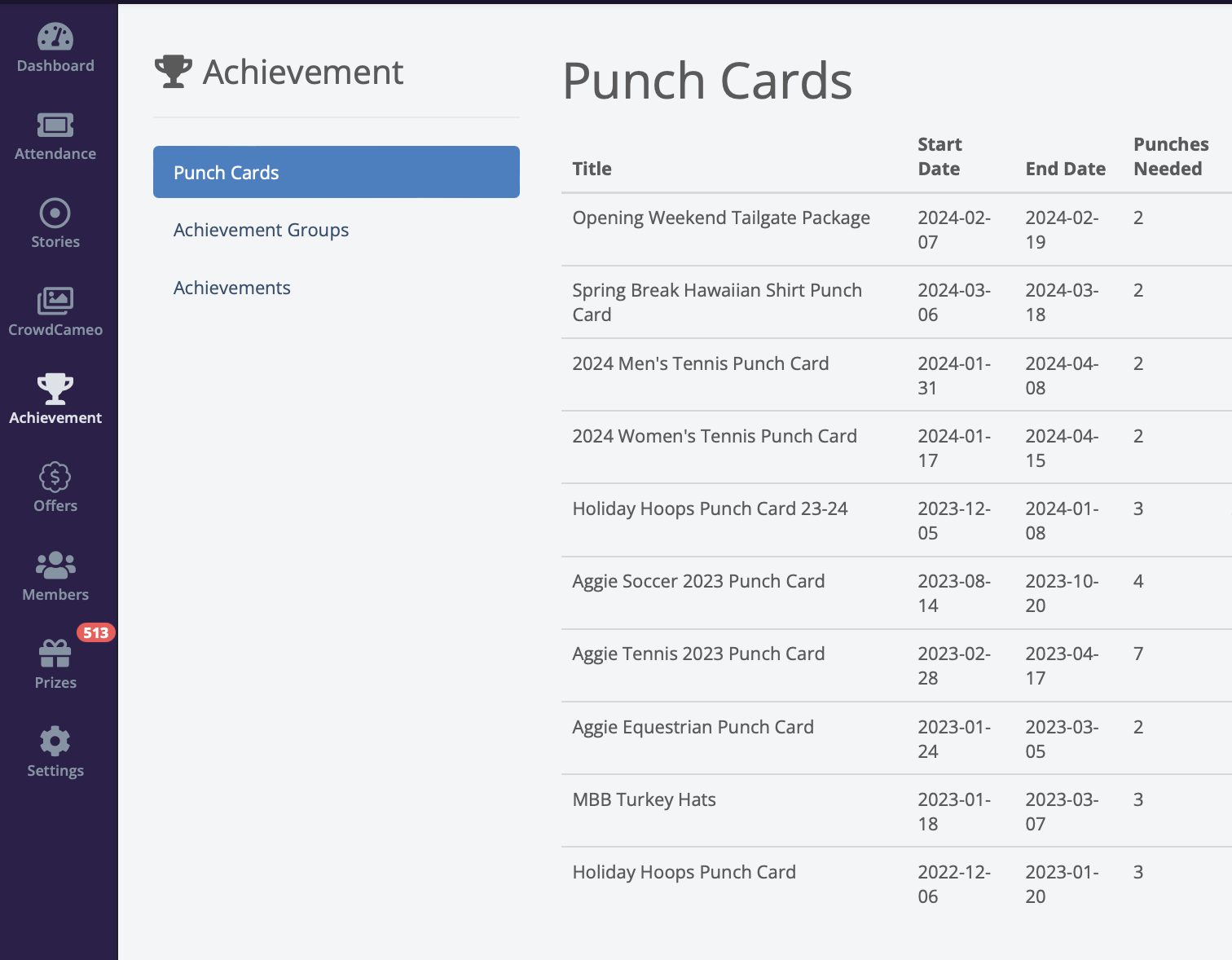 The dashboard shows all punch cards that have been set up. Here you can find the dates the punch card was running, how many punches were needed to complete the punch card, how many members participated (attended at least one event), total number of punches, and total number of completed punch cards.