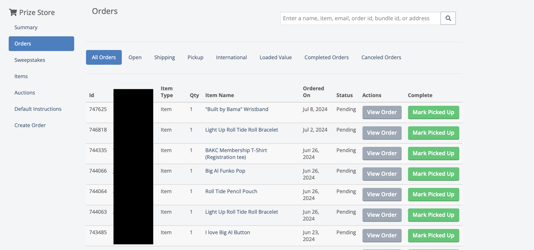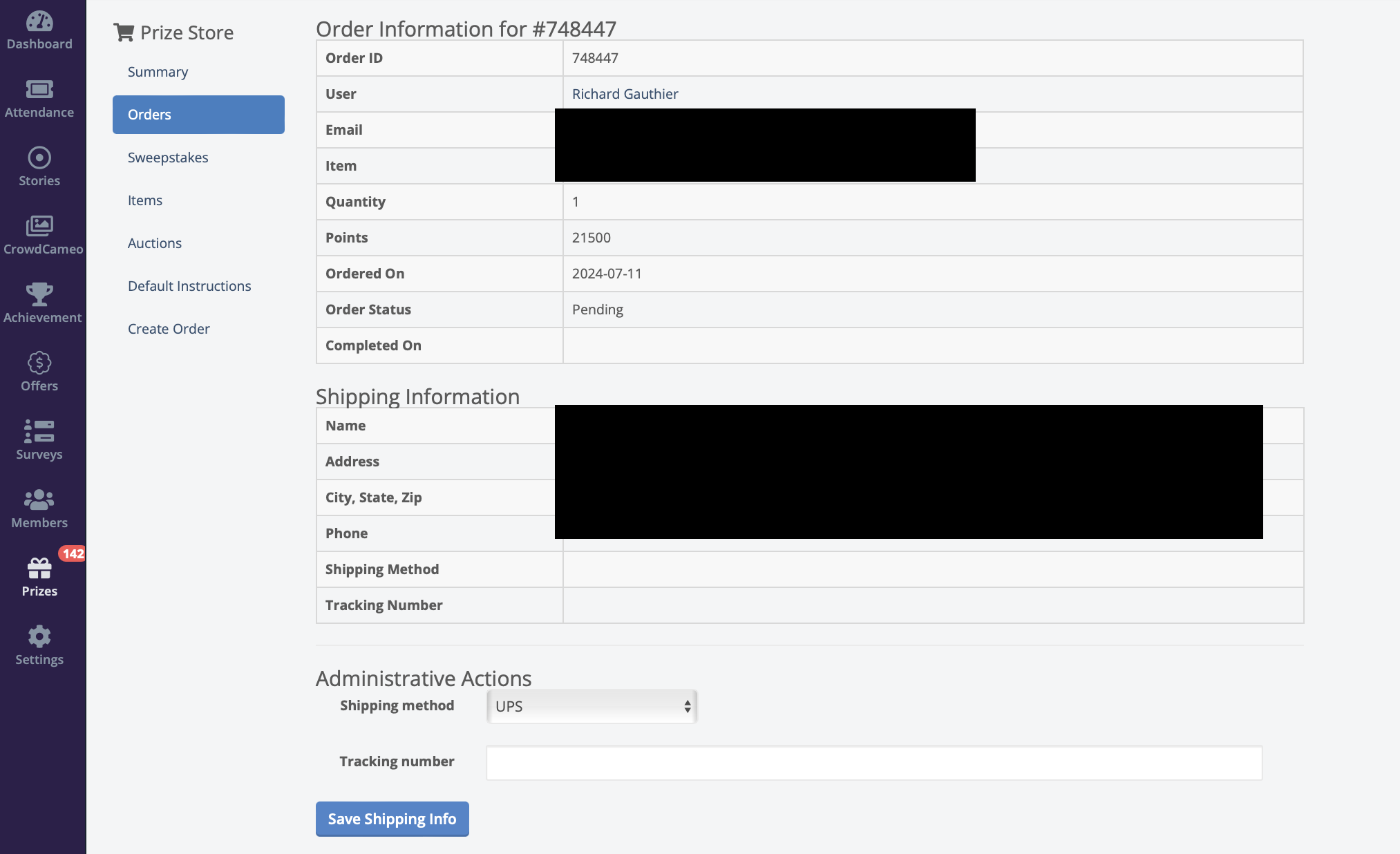 Prizes - Right after a person redeems the item from the Prize Store, it will appear in the orders tab.