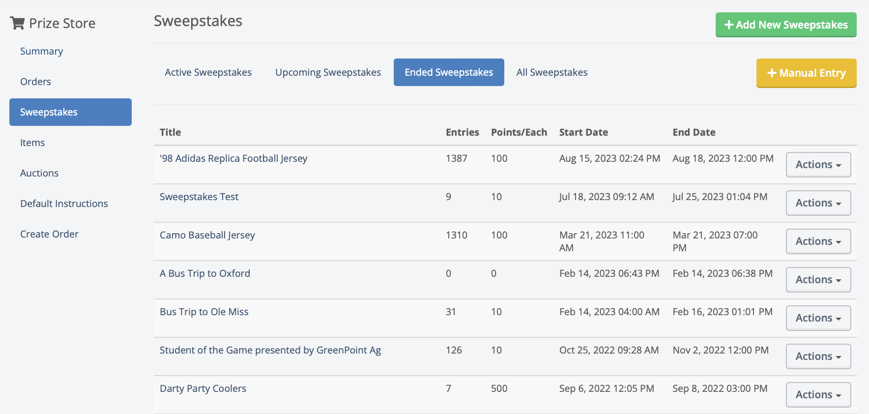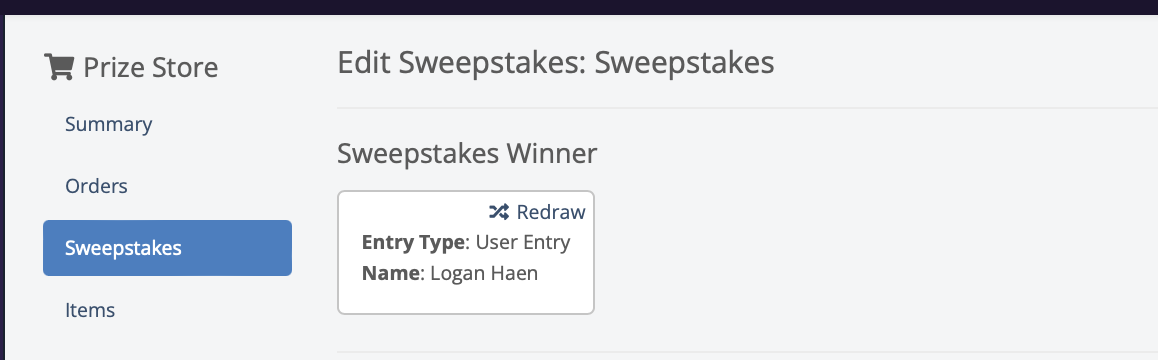 If you would like to redraw a winner of a sweepstakes, go to your Ended Sweepstakes and then hit on the name of the Sweepstakes that you would like to redraw. That should bring you to a screen like this where you can hit the redraw button to reshuffle the sweepstakes winner.