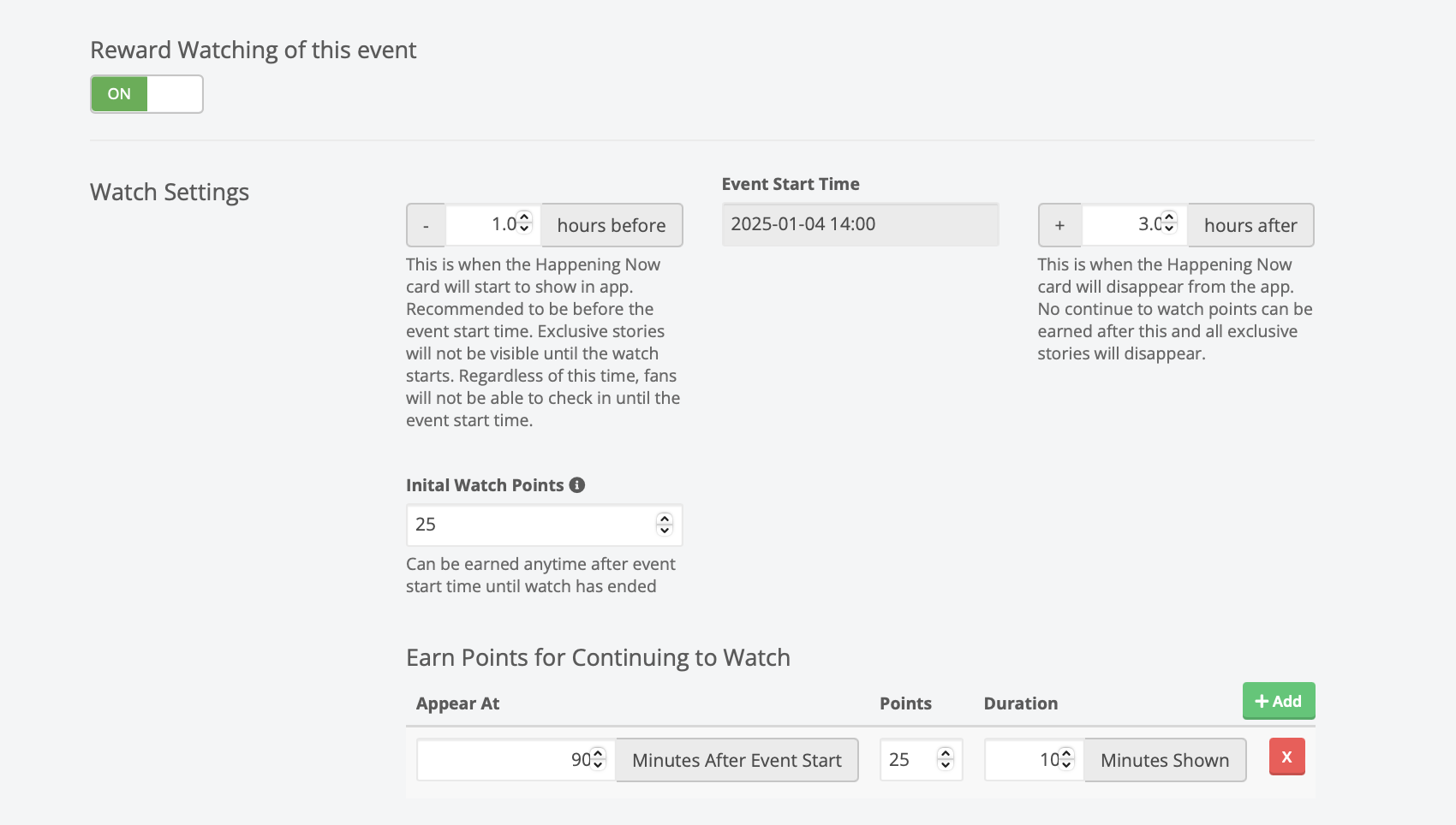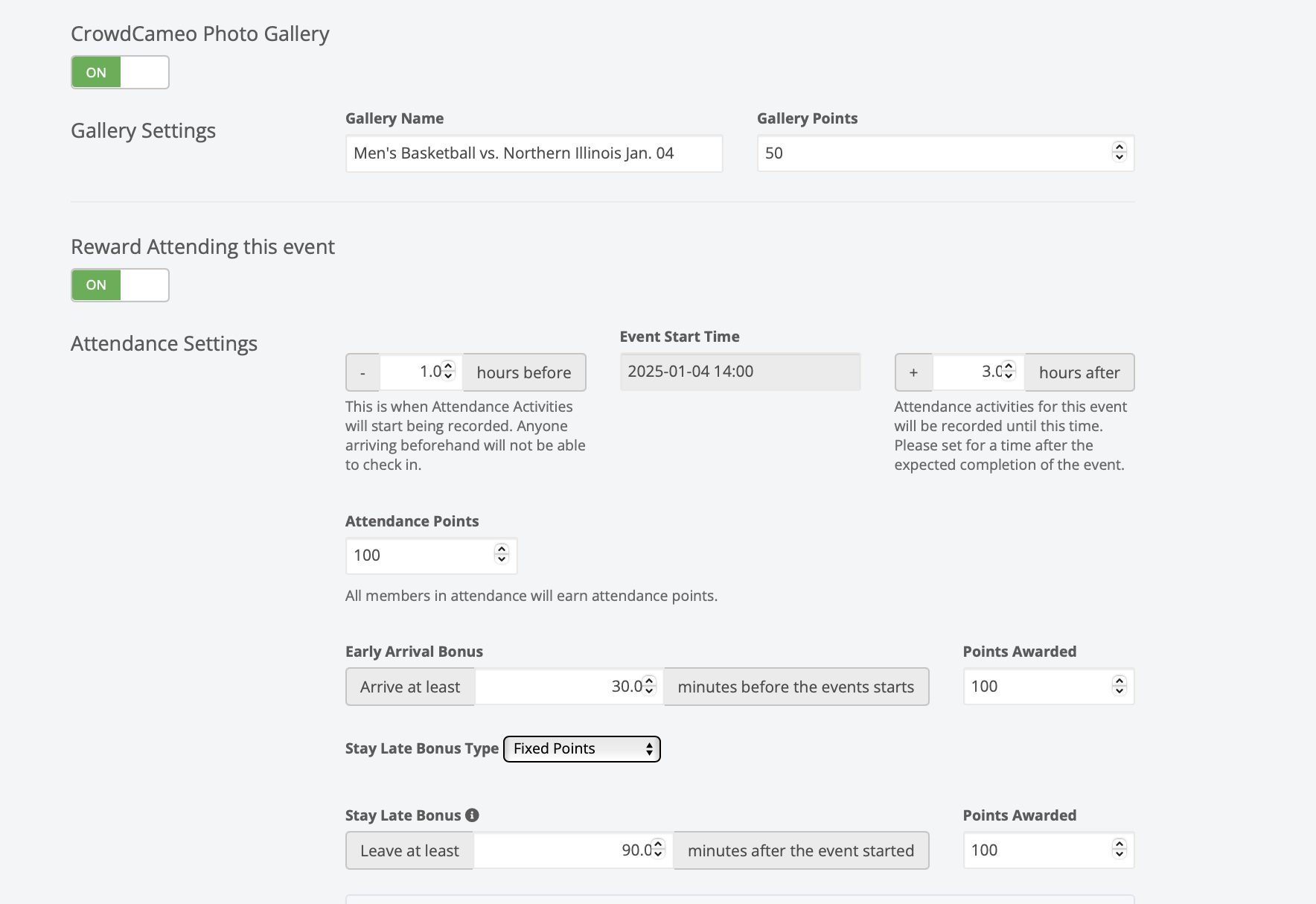 We can also turn on and off and adjust the default settings for any of the below settings for your events brought in by the SIDEARM Sync. Keep in mind, these default settings will be brought in across all future events across all sports, so make sure you adjust any event or sport-specific point settings prior to the event.