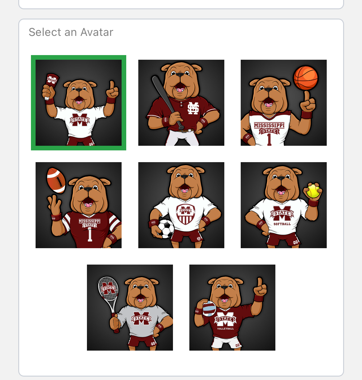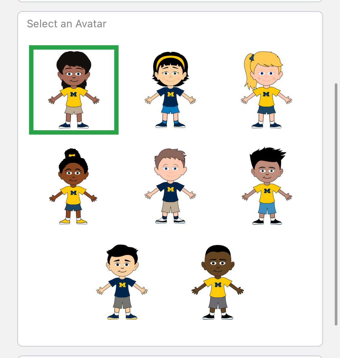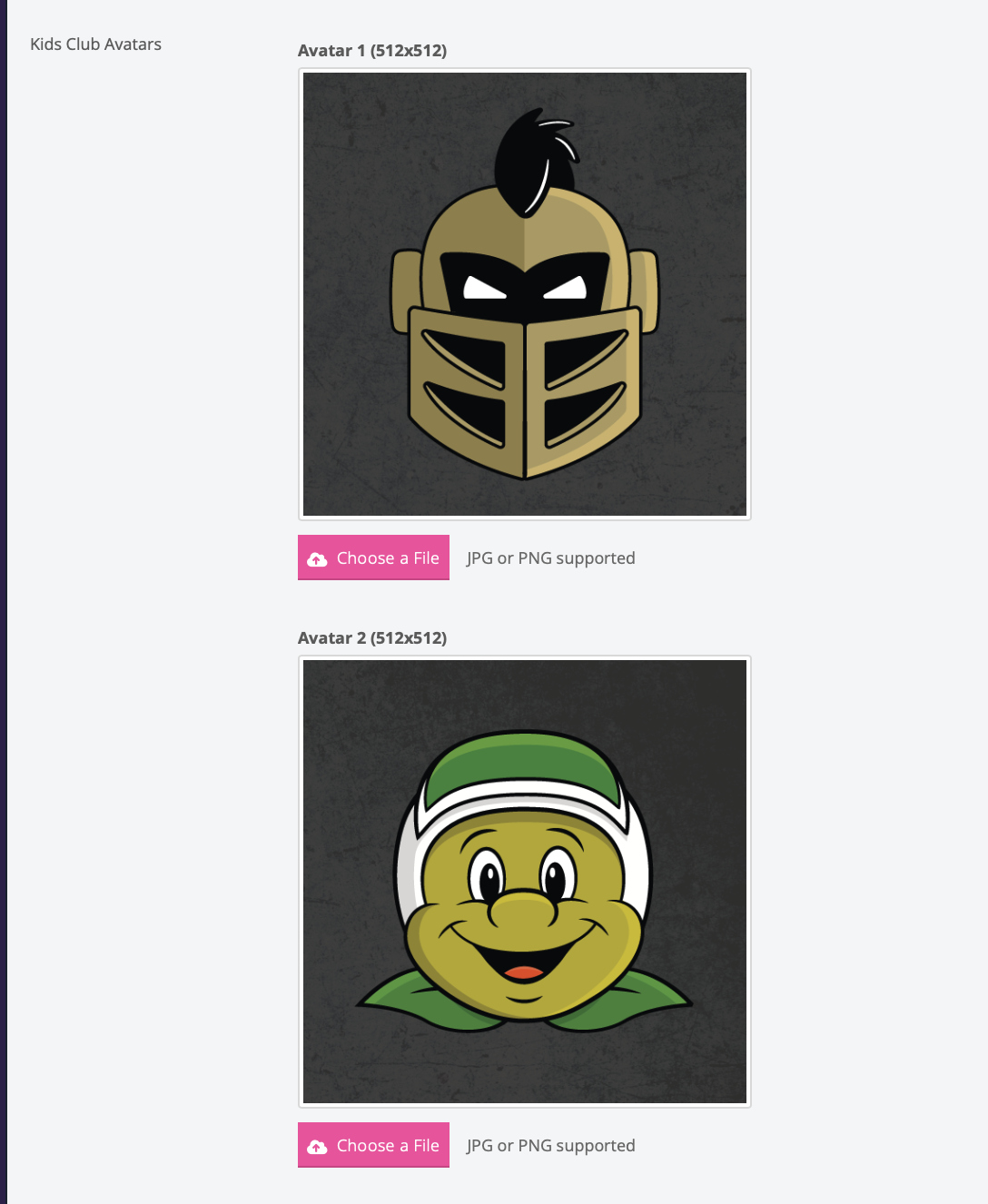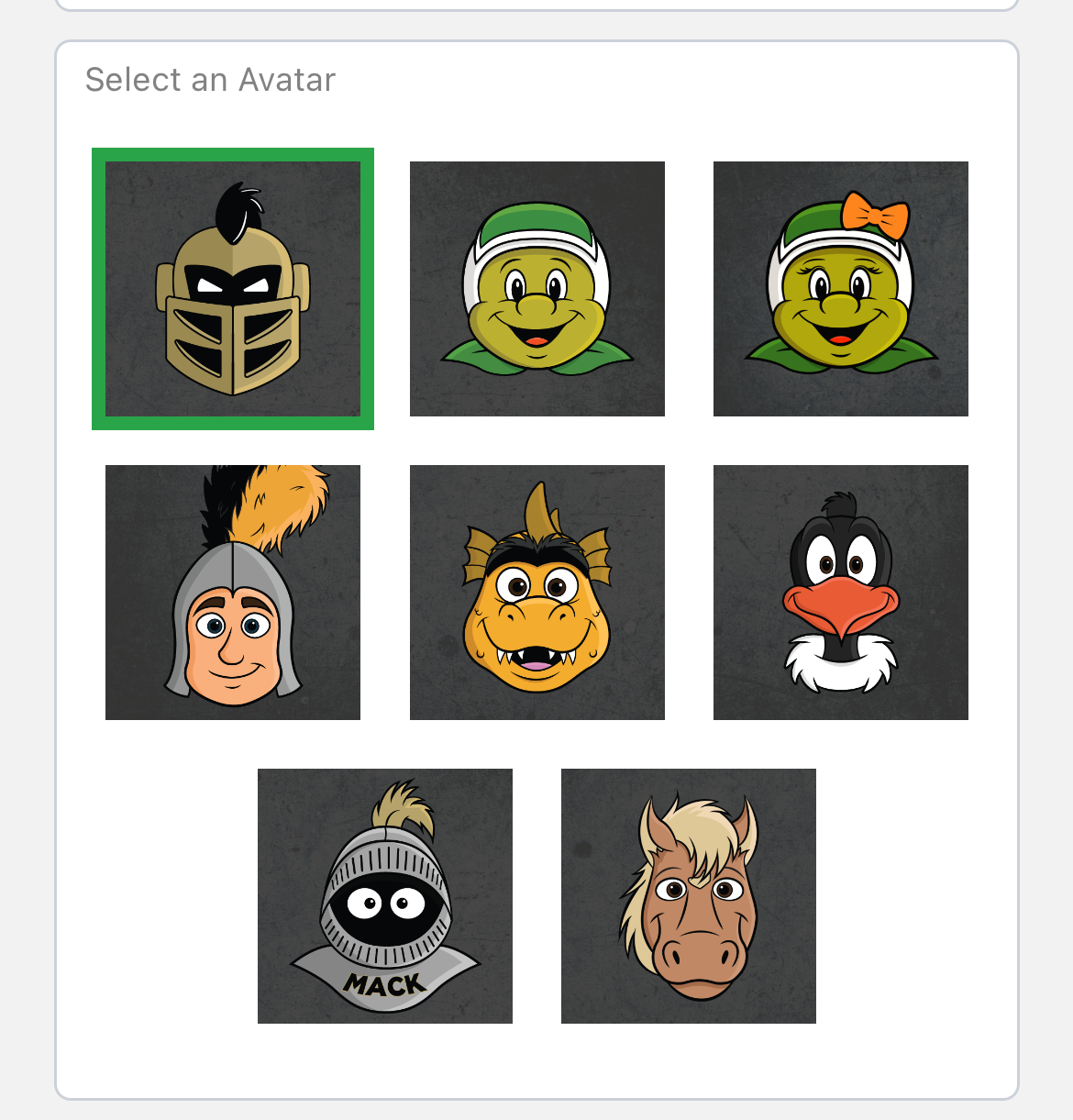 You must create eight avatars for kids to choose from in your program. An avatar will show in the kids profile so you know which kid is logged in at the moment.