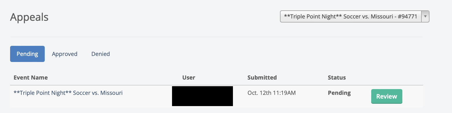 If there are any appeals for the associated event, you will see the user who submitted the appeal, when they submitted it and the status (pending, approved, or denied)