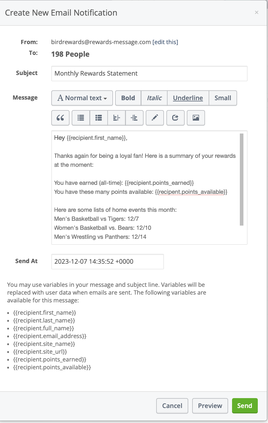 Optional - Add a Link to the Message . This can be tied to an Event, Auction, Prize, Sweepstakes or an external URL