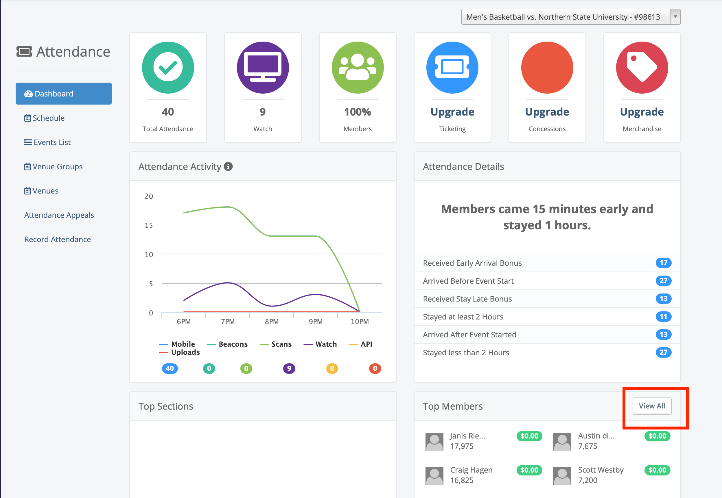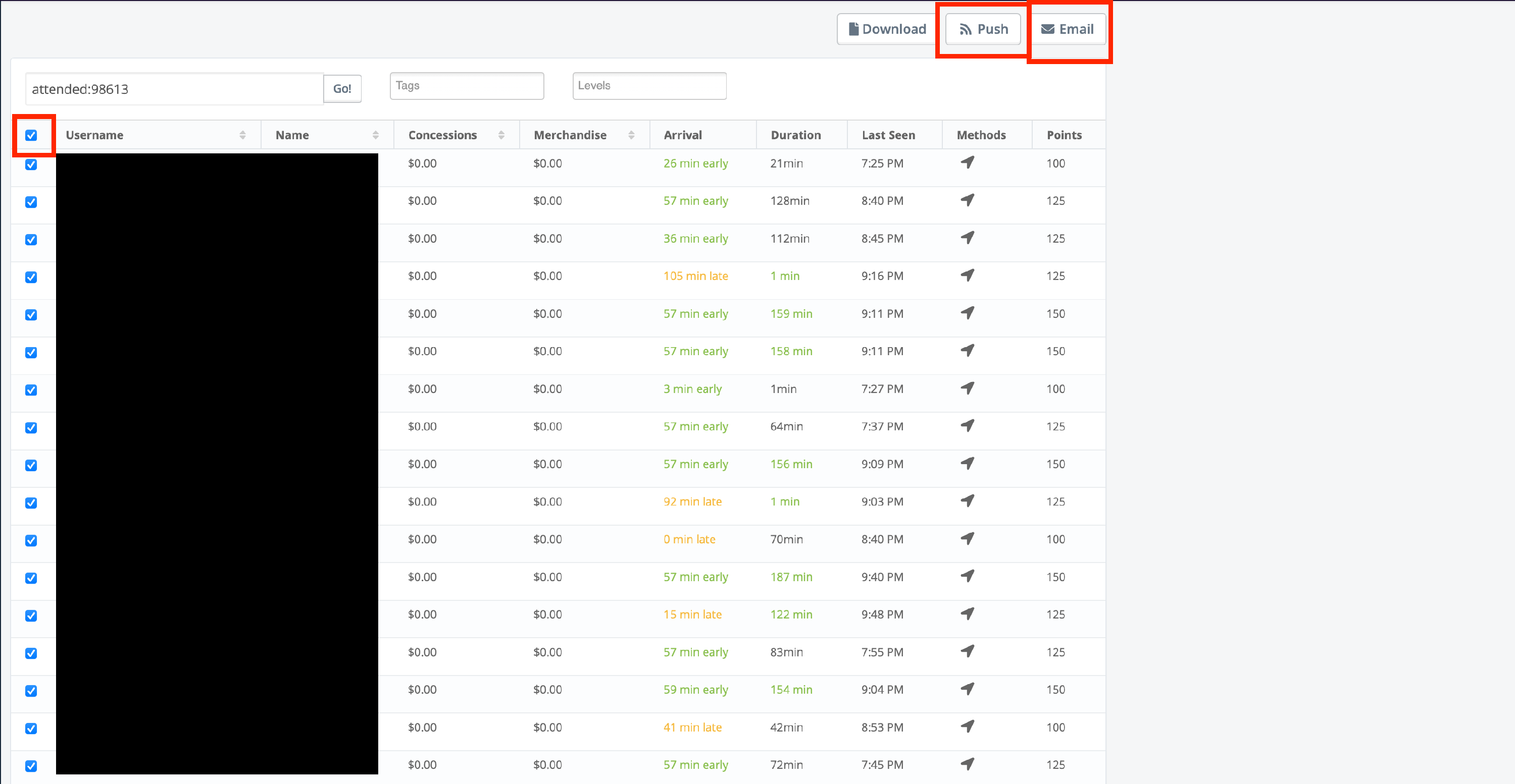 You can easily send emails and push notifications to your members attending an event via the Attendance Dashboard