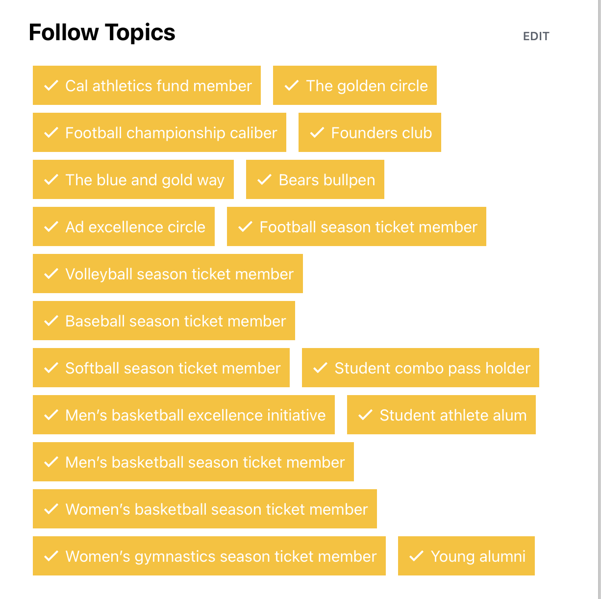 Consult your Fanmaker POC or help@fanmaker.com to get Topics added to your site. Once added, edit them under Settings → Topics to Follow.