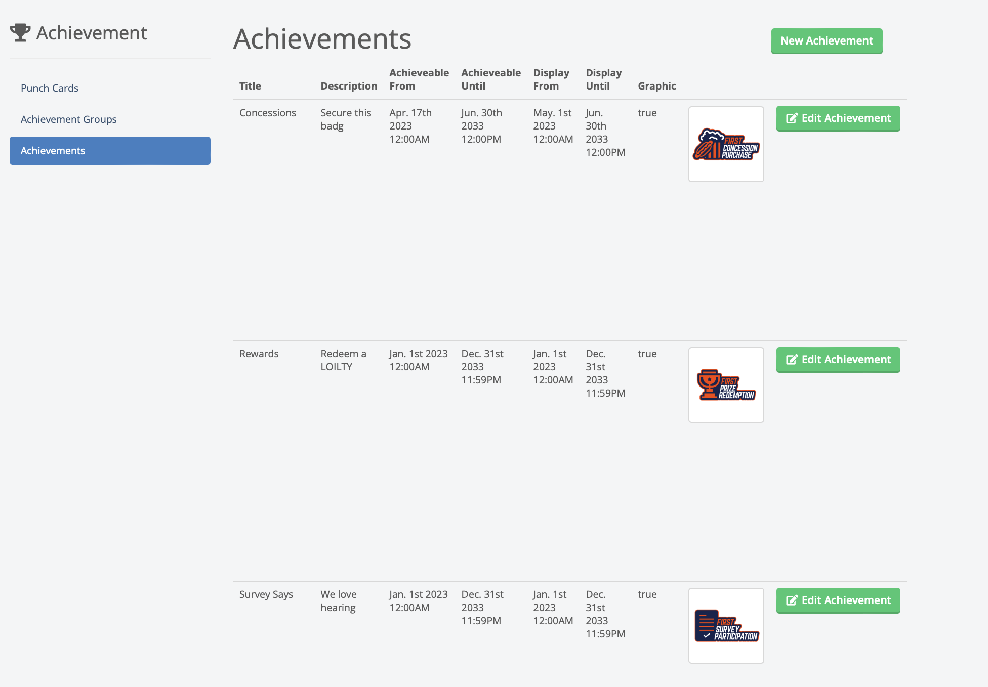 A place to reward your Fans for achieving specific goals like First login, First Concession Purchase and First Game attended. Achievements can have their own achievable dates and display from dates, to customize when your fans can see their eligible achievements and when they can achieve them.