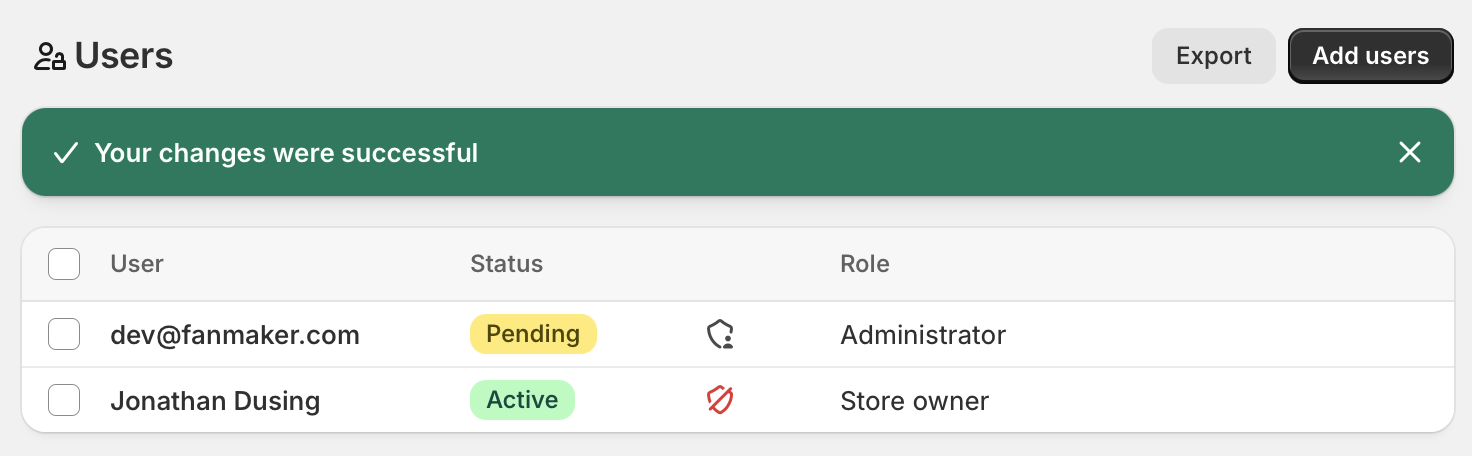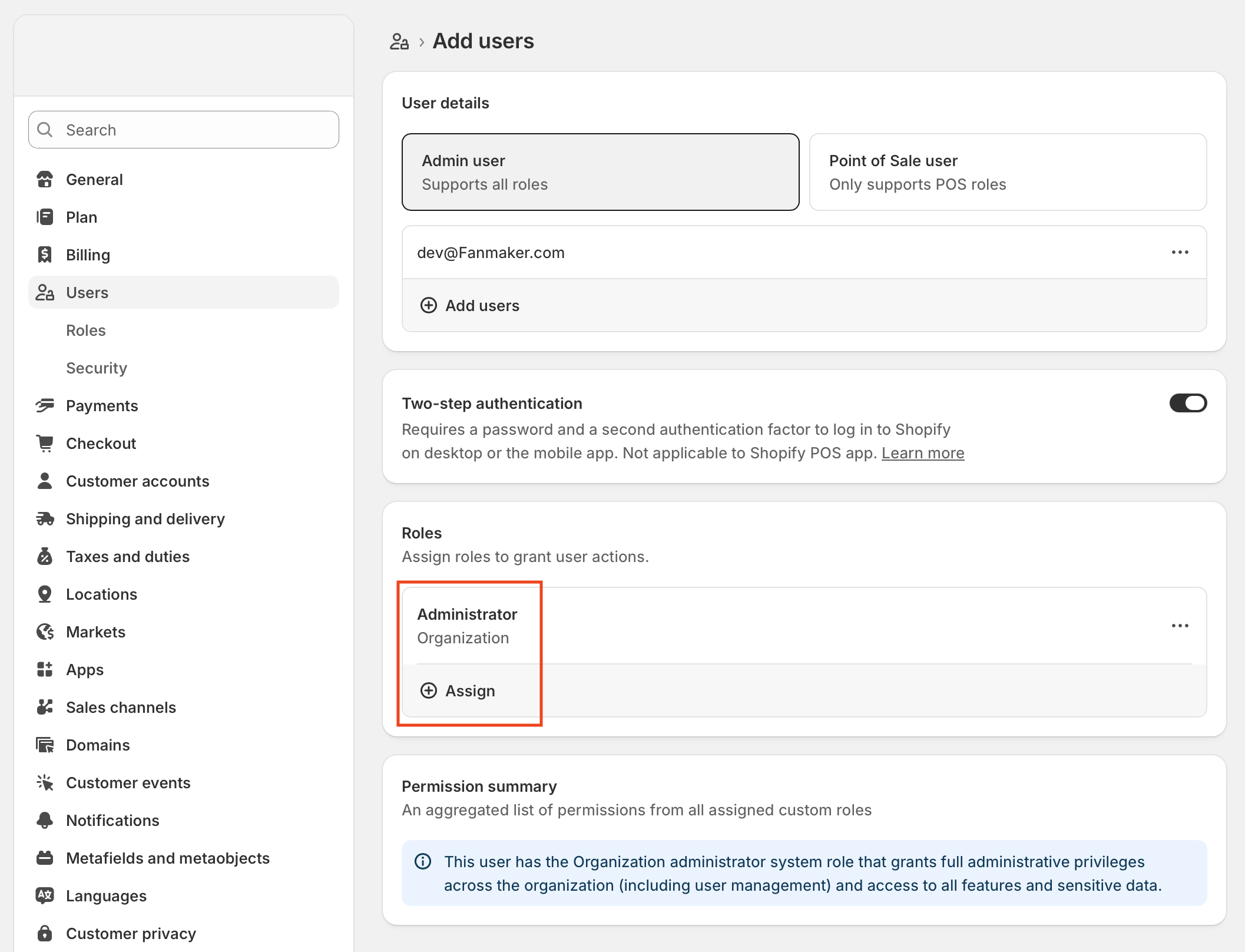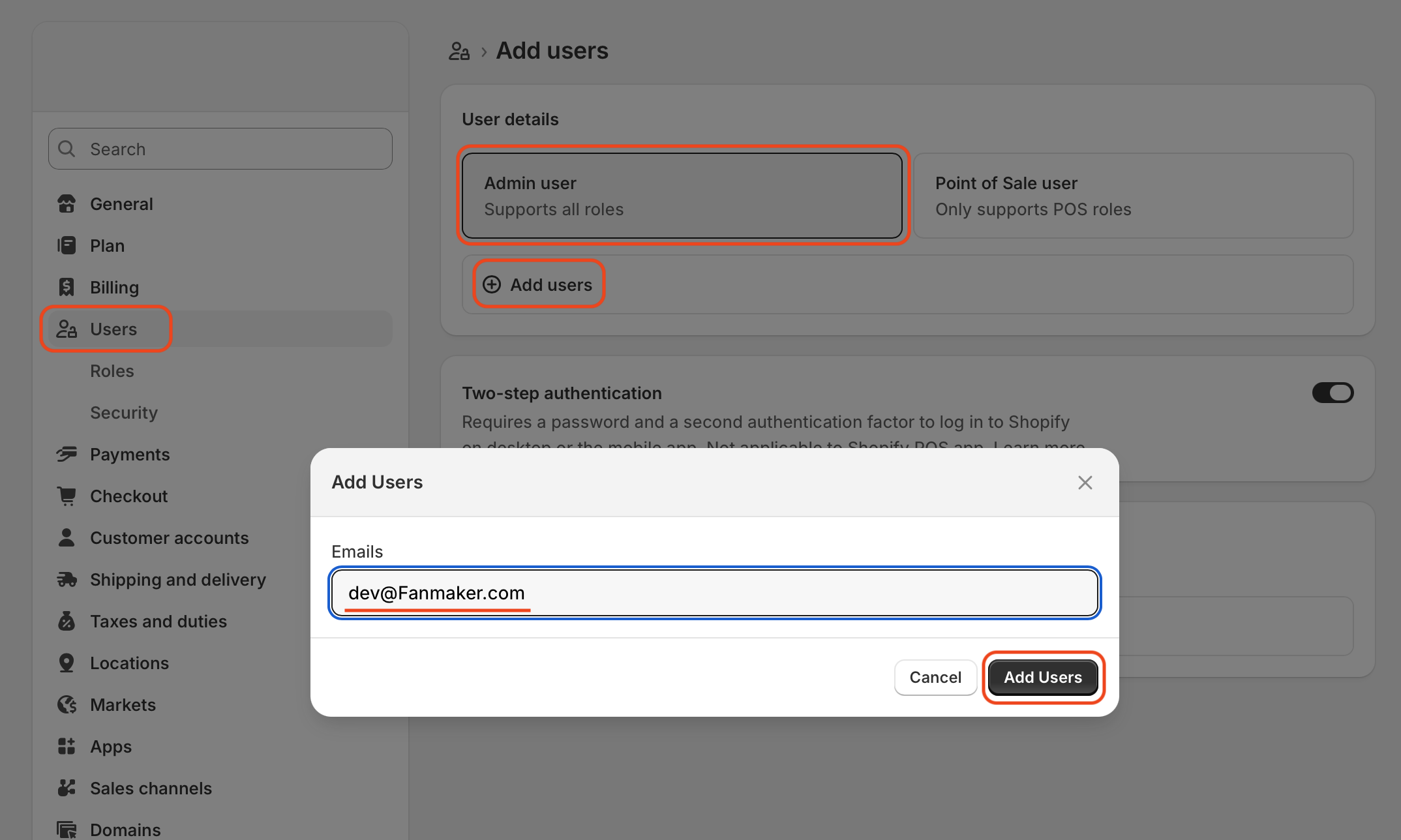 To enable Fanmaker to track merchandise sales and integrate with your Shopify store, our development team requires temporary administrative access to your Shopify backend.
