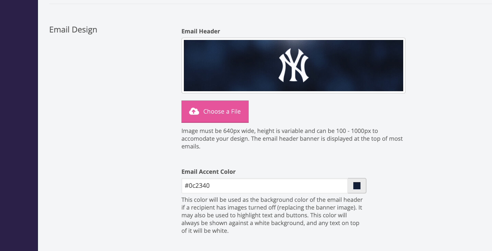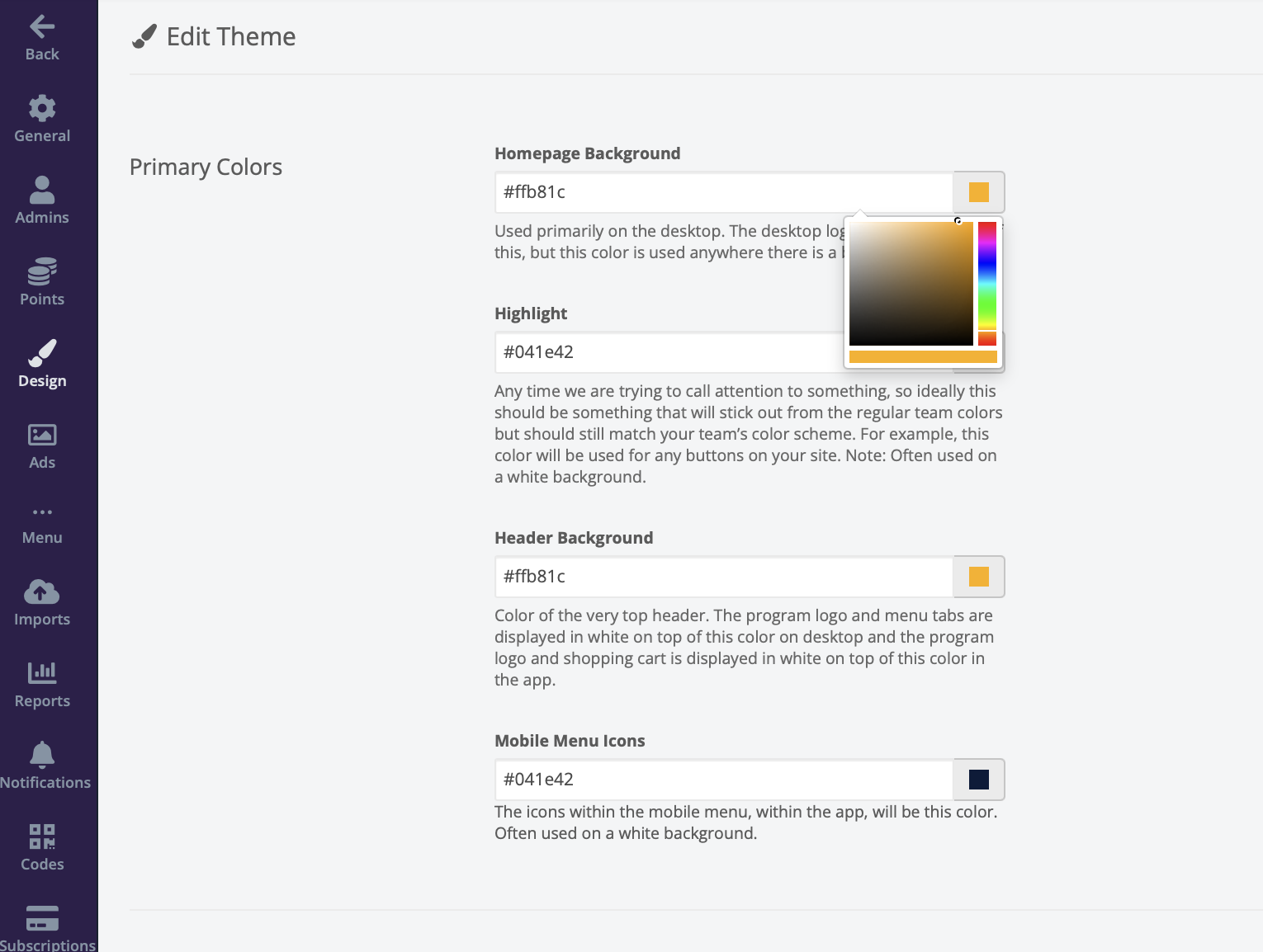 All colors are hex-decimal colors or for web color. When initially setting up your colors it is best to have your team’s official hex colors on hand.