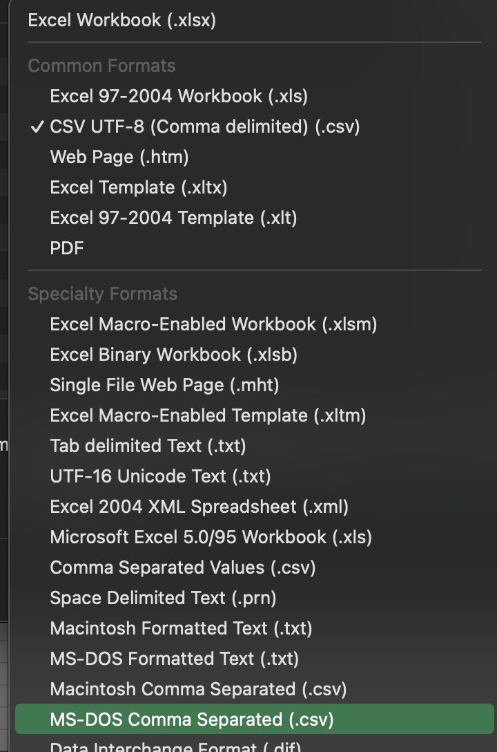 Please save your .csv files using the MS-DOS Comma Separated value option for best import results!