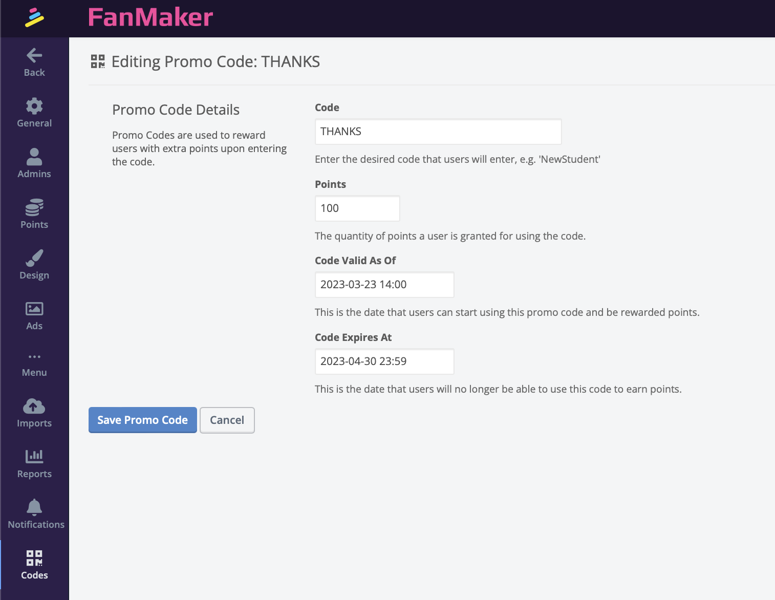 Enter the date that users will no longer be able to use the promo code to earn points.